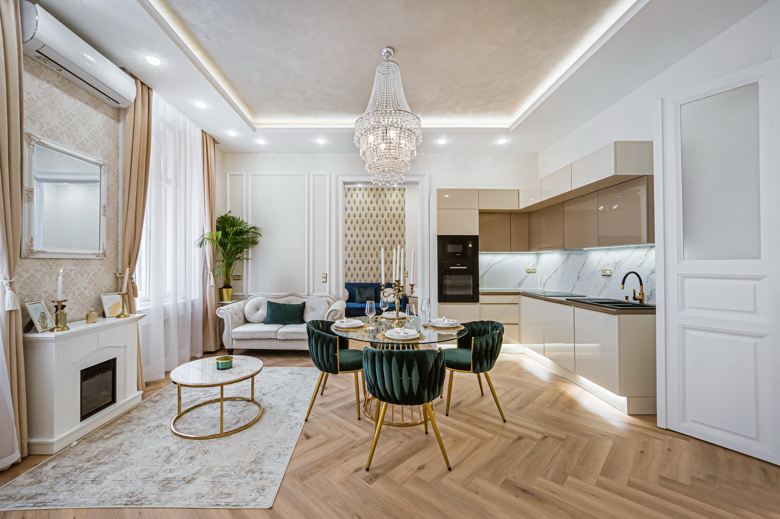 The apartment boasts modern technological solutions such as smartphone and touchscreen-controlled air conditioning and temperature regulation. Built-in Bluetooth speakers in the false ceiling provide soothing relaxation after a tiring day.