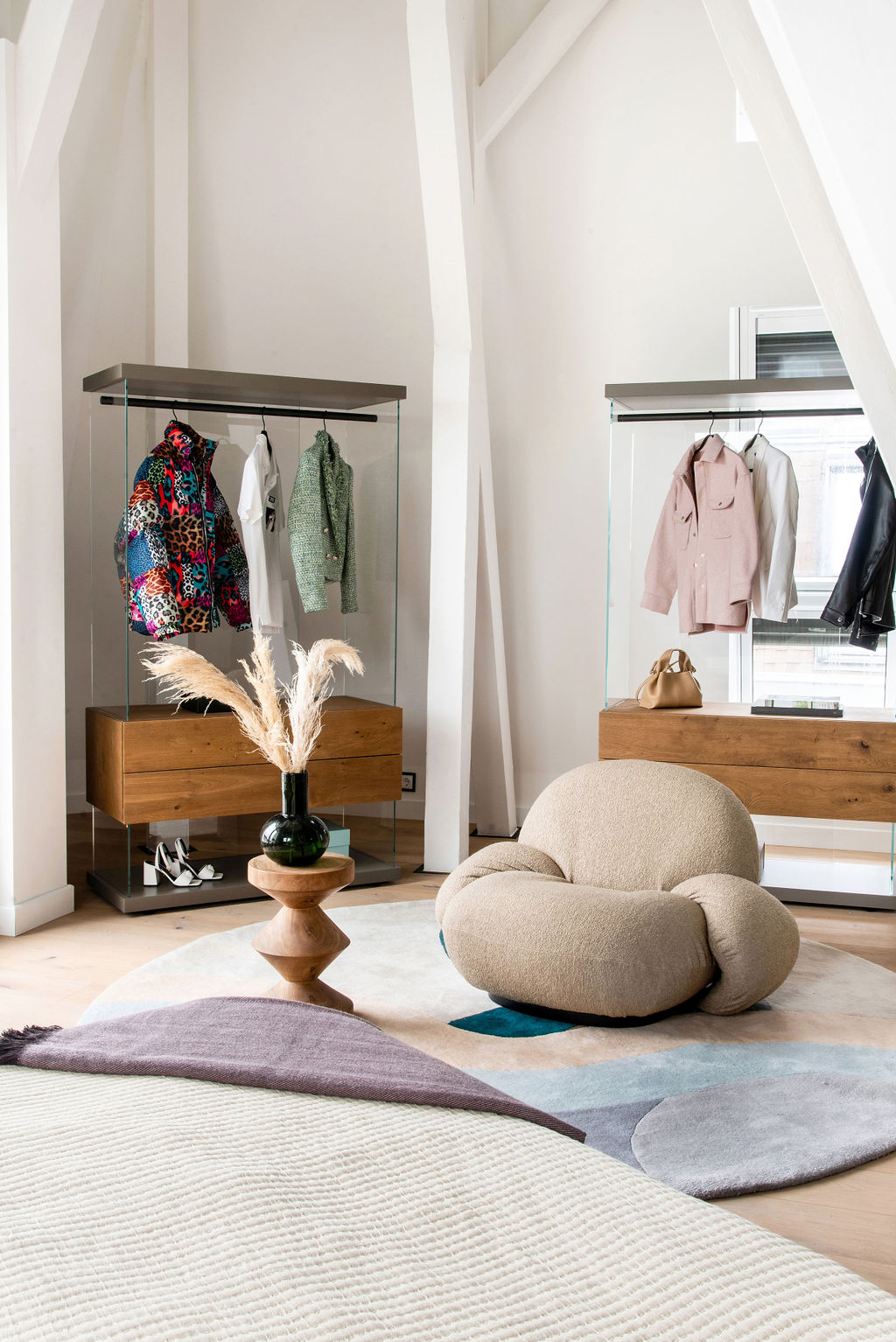 The apartment has open spaces, with an interior height of 7m at its highest point.