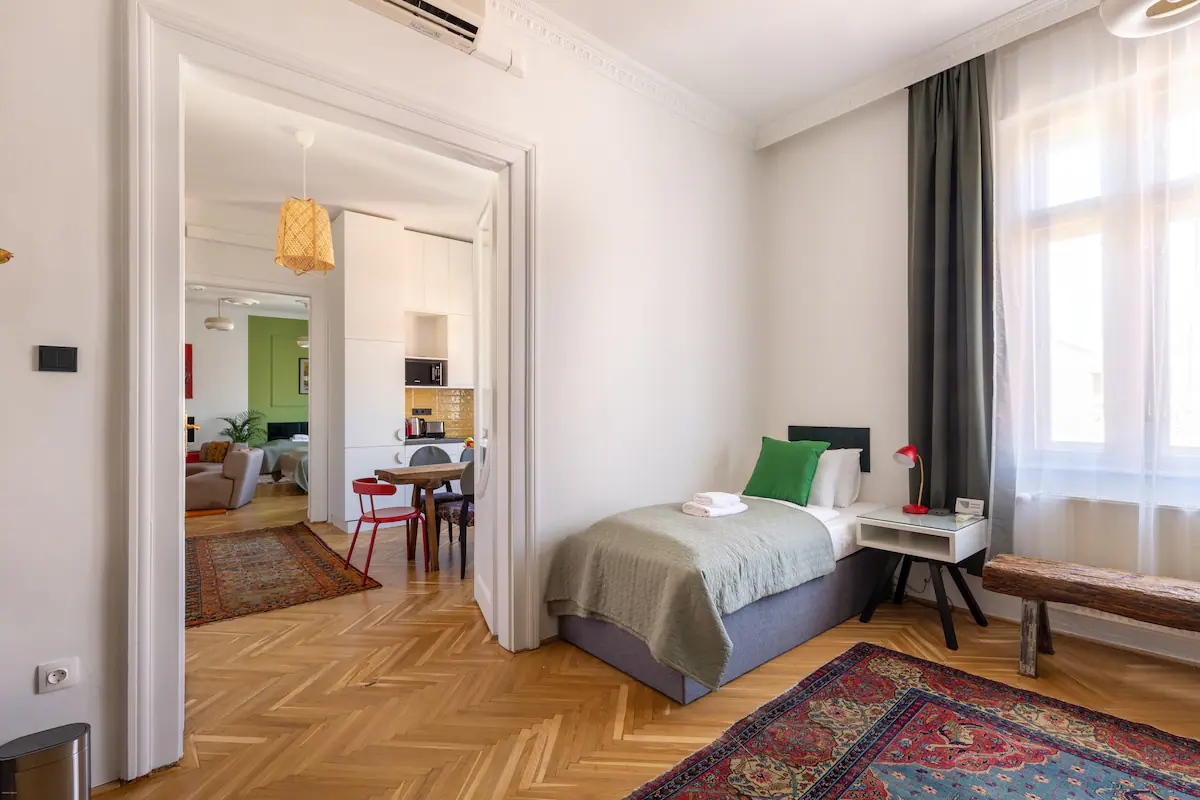 Az egy HRSZ-en lévő ingatlanból 4 db AIRBNB apartman került kialakításra, melyben összesen 20 db vendégágy található. Az ingatlan kialakítása és berendezése az AirBnB üzemeltetésnek megfelelő modern, egyedi belsőépítészeti megoldásokat és berendezést tükröz.